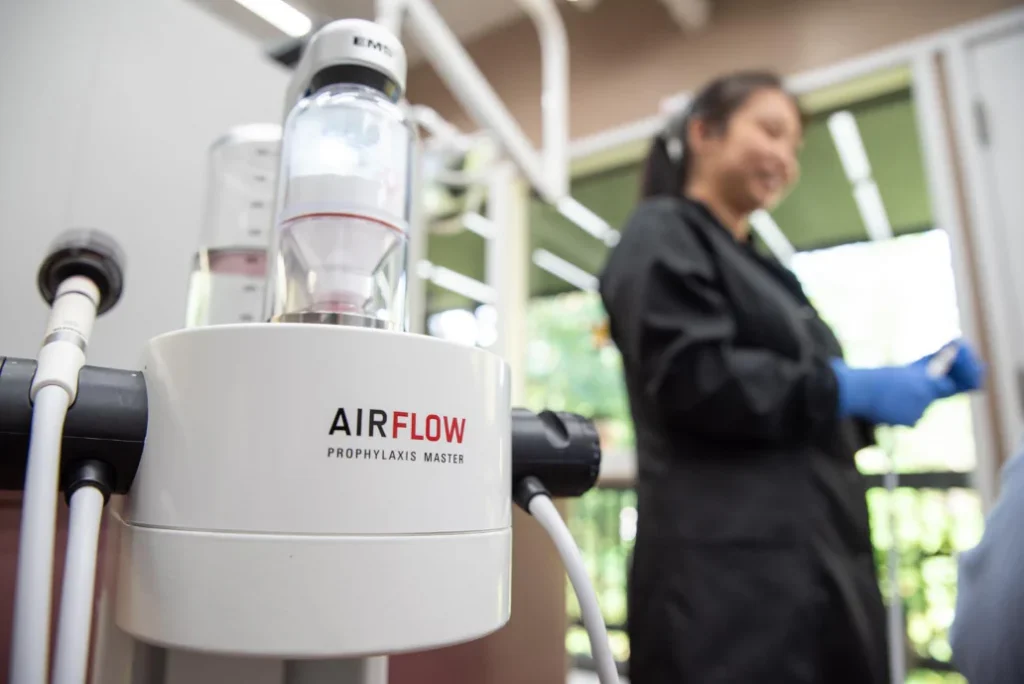 Say hello to the AirFlow® Prophylaxis Master—your smile’s new best friend! This cutting-edge tool gently removes plaque and stains with a warm, soothing air, water and powder jet. It’s comfortable, mess-free and perfect for sensitive teeth. Your cleanings just got quicker, cooler and way more fun!